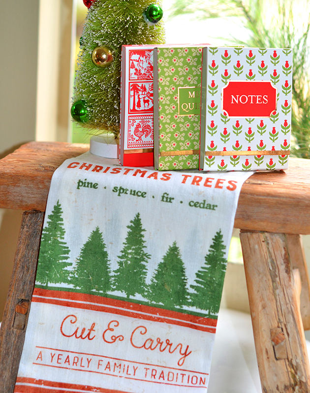 This year we have an assorted trio so you can keep one for yourself and gift two of them as stocking stuffers. And they are paired with a sweet soft flour sack towel that says CHRISTMAS TREES CUT & CARRY… A YEARLY FAMILY TRADITION.