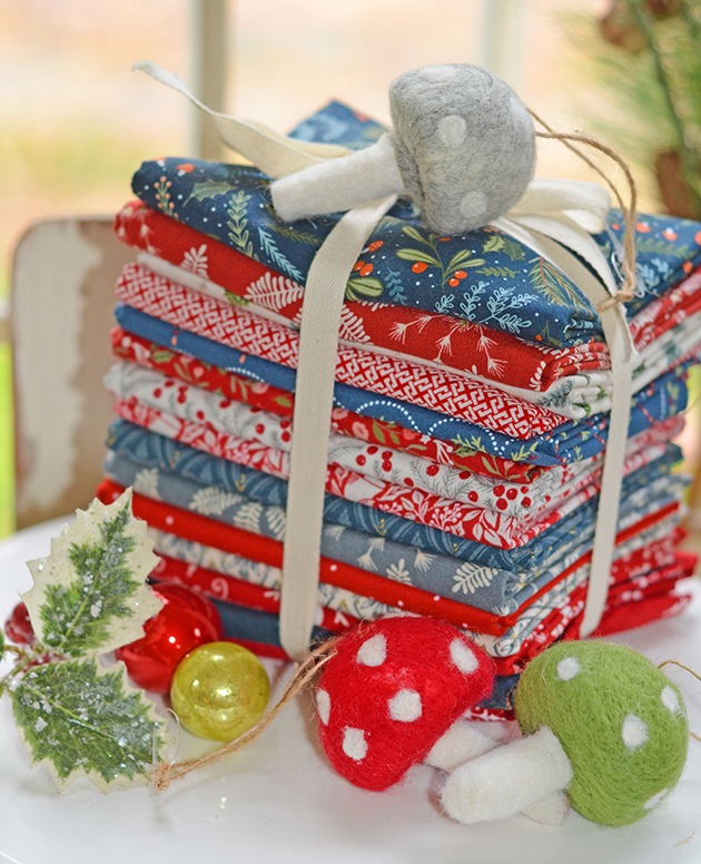 Each bundle has (15) 1/2 yds. holiday themed fabrics in classic Christmas reds, ivories and winter blues. And we could not resist adding my favorite felt mushroom ornament to this one [colors are assorted]!