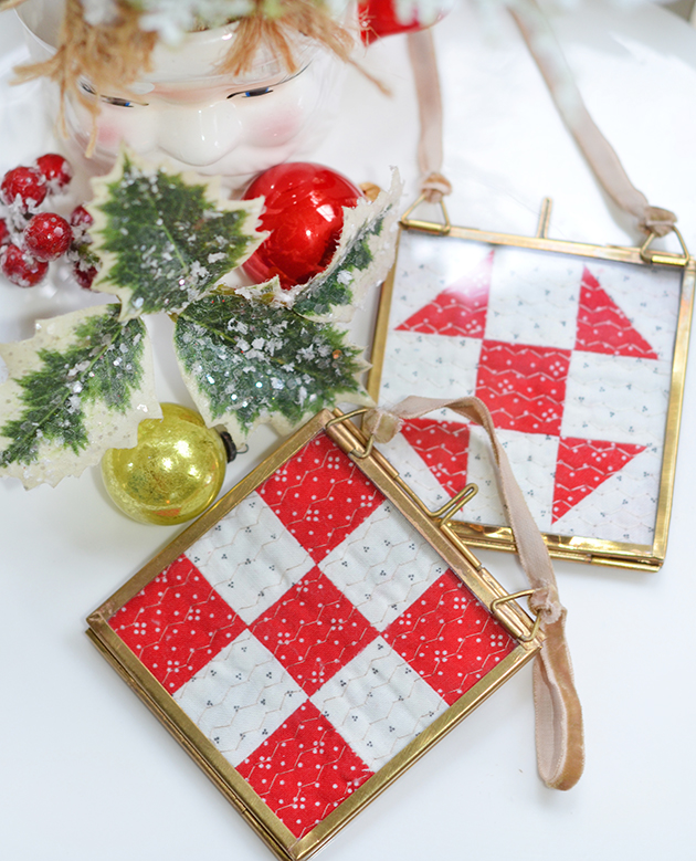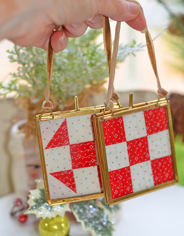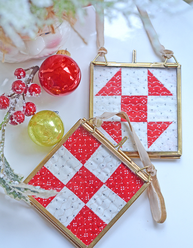 Each kit contains (2) 3” x 3” brass frames, red & cream fabrics to make blocks and pattern directions.