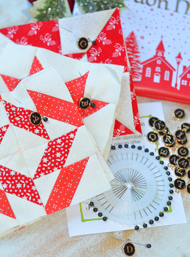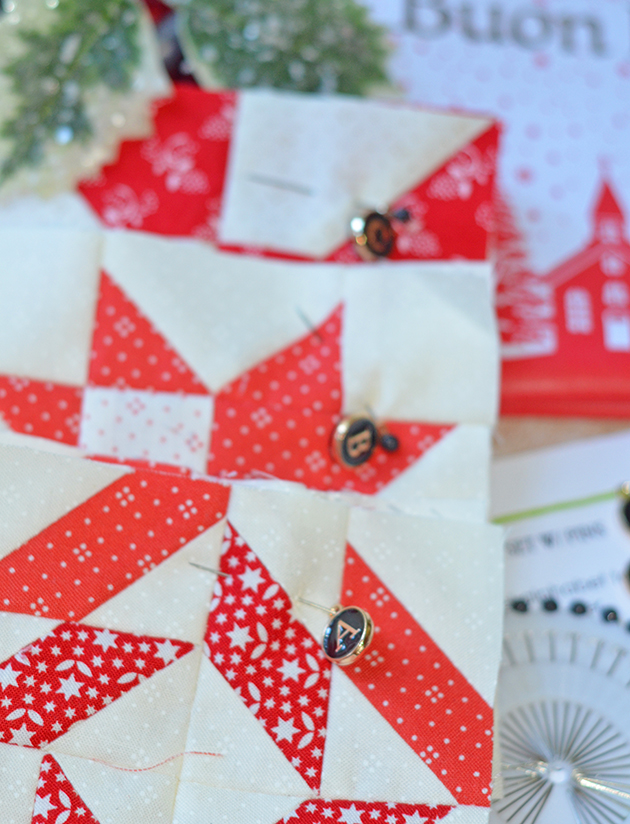We have been using them in the studio for a while now and they are the perfect charming little way to mark your blocks, your rows, your block piles. A classic black headed pin and a sweet little enamel marker has become my favorite way to organize ourselves during quiltmaking!
