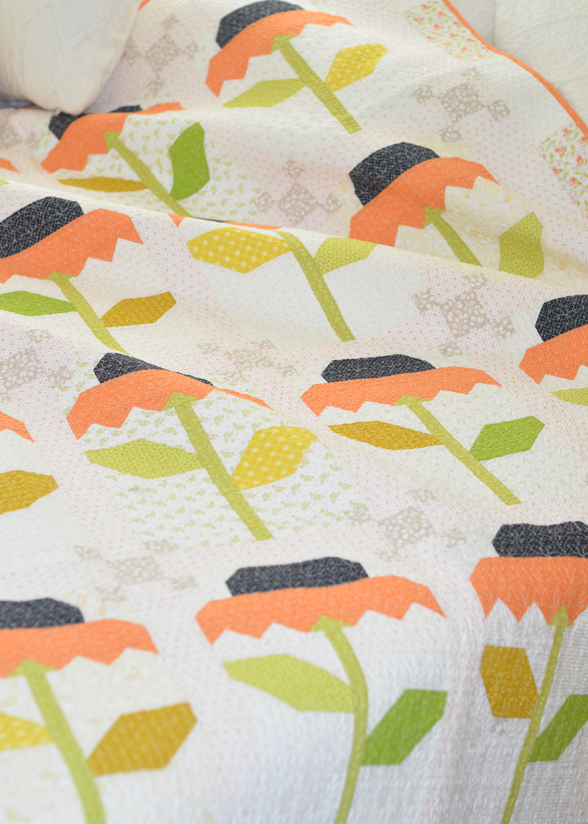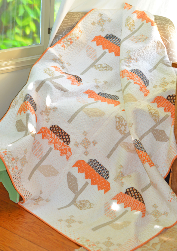 But of course I could not let go of the idea of the traditional Black Eyed Susan flower and thus decided to include them both. The traditional “Black Eyed Susan” came first with its black cone top and orange or yellow leaves, this flower is the epitome of late summer for me. I used a few favorite EYELET prints for the flowers and then mixed it up on the leaves as well as scrappy low volume cream backgrounds. It is so good!