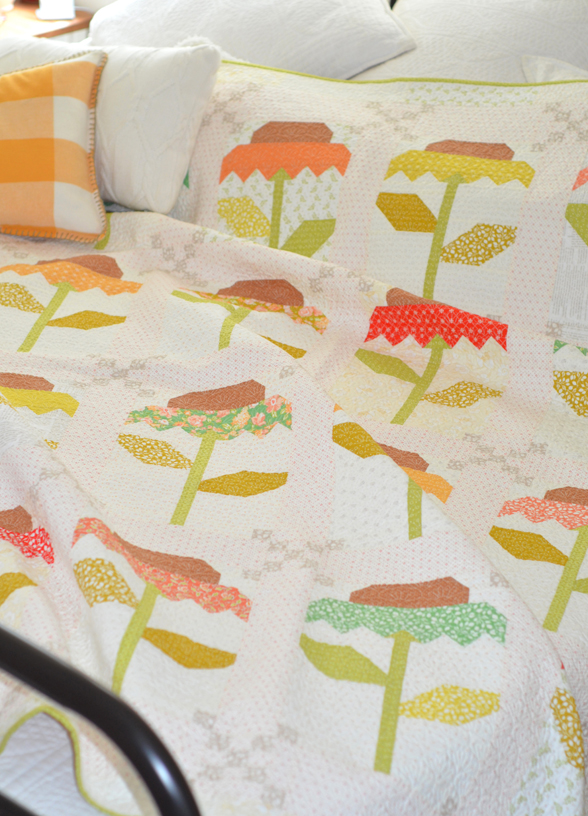 Gosh I know I say this all the time, but it is quite possible that this will go down as one of my top 3 favorite flower quilts I have ever designed. There is just something about it that is fun to construct, not hard to be successful at [not a lot of points to match or anything that will make it arduous] and it looks good in SO MANY different color combinations.