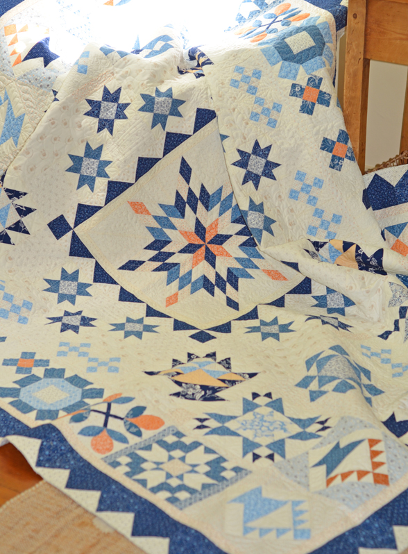 The STONEWASHED SUNSET BOM was a mix of primarily blue and cream fabrics from the DENIM & DAISIES collection. The blues focused on the primary denim color with the complimentary tones of the lighter blue and the darker midnight blue from the collection serving as coordinates. The oranges, caramels, and tangerine fabrics from the collection served as accents and pops of color throughout the quilt.