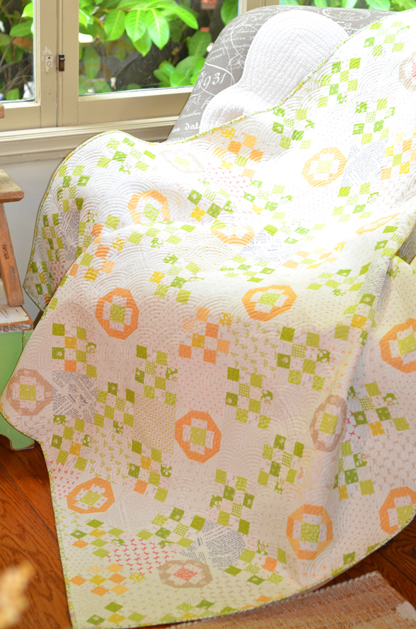 The below quilt uses 2 yards of the green colorway. We rounded the corners for a fun detail by tracing around a dinnerplate!